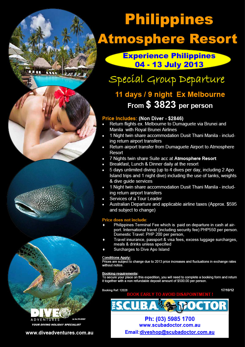 | Atmosphere Resort, Philippines, dive trip organised through: The Scuba Doctor (Rye, Victoria) -- https://www.scubadoctor.com.au and Dive Adventures -- https://www.diveadventures.com.au There were many of us from Melbourne on this trip, including: Peter Fear, Valerie Fear, Lloyd Borrett, Cheryl Lees, Benita McDonough, Bill Boyle, Leo Scicluna, and Paul Williams. |