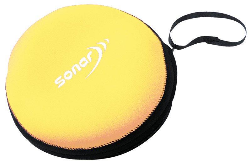 A custom made, 380 mm diameter, 80 mm deep, Sonar Regulator Bag, made out of 5 mm yellow and black neoprene is used to store my recreational diving regulators and instruments.
