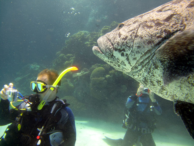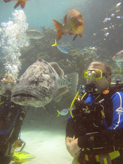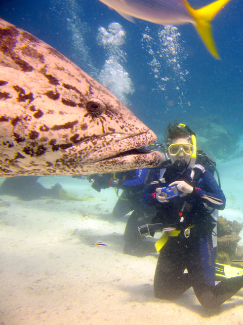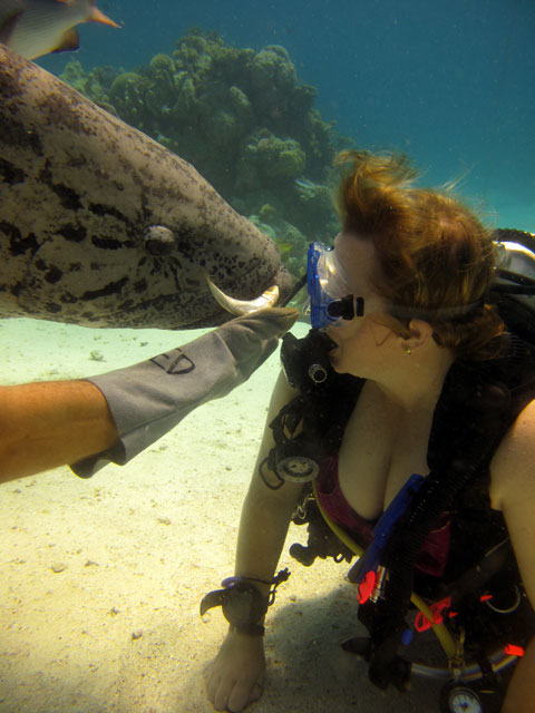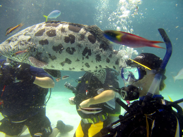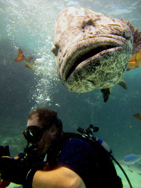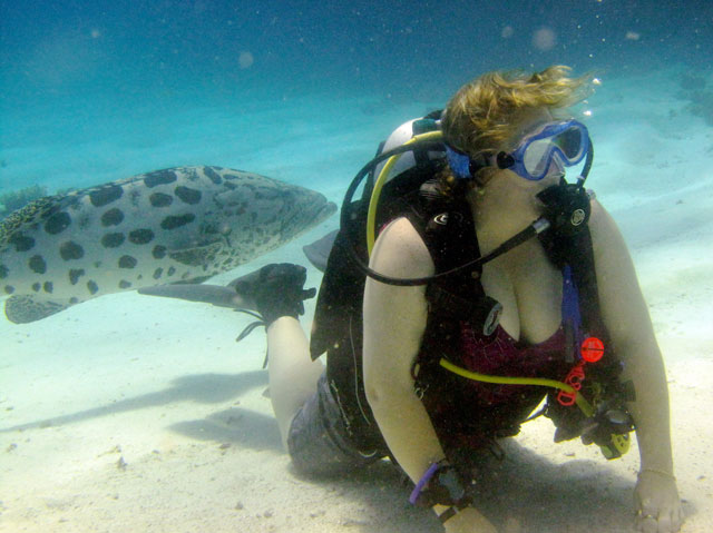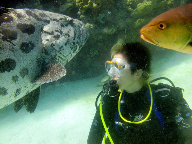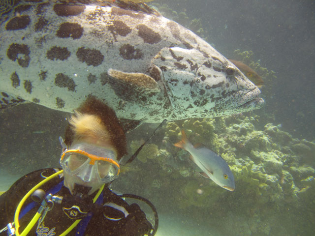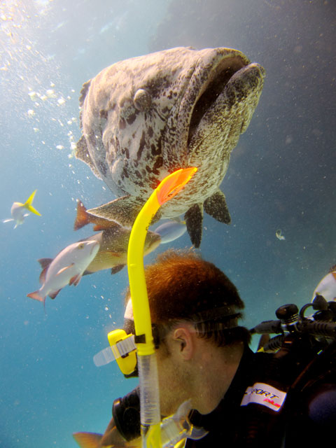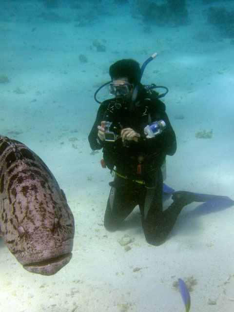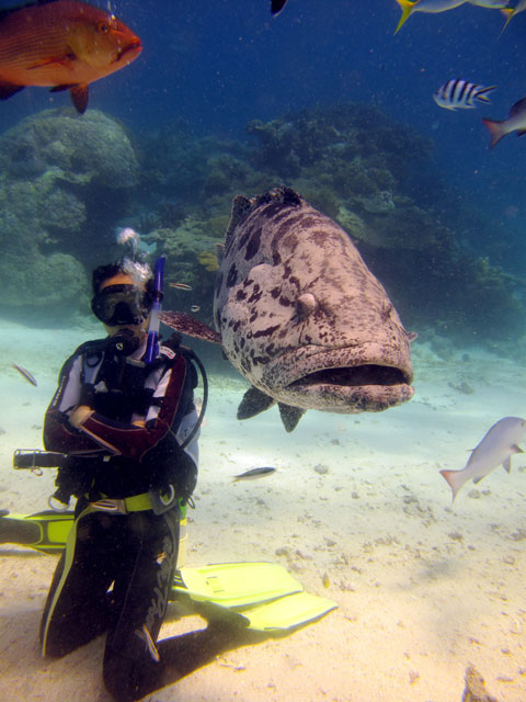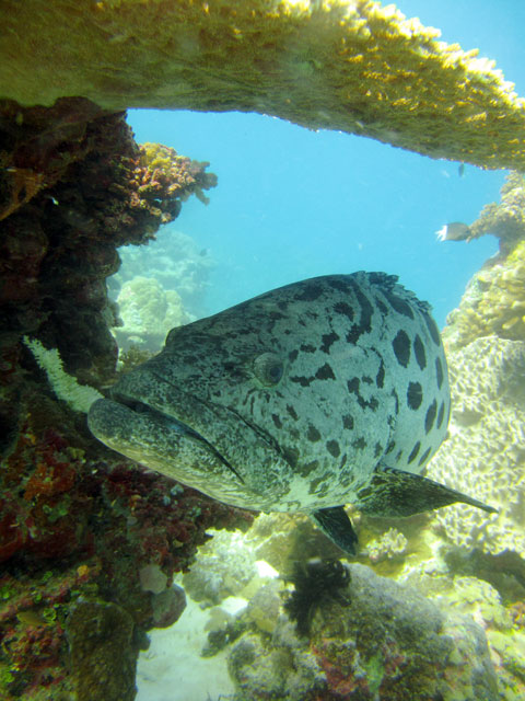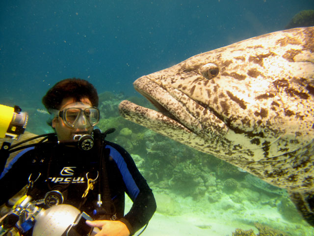 | Boat: Spirit of Freedom, TUSA Cairns Dive Director: Mossy, TUSA Cairns Excitement was everywhere aboard with the anticipation of the famous Cod Feed dive. After Mossy's briefing we entered the water and headed over to the cod feed area. We all gathered in a large circle as Mossy took up the centre spot. A number of large cod were already in the vacinity. The top cod duly came in and Mossy started the feed. A few times one of the other cod tried to mussle in on the action, but the head cod quickly chased it away. The whole thing was a most delightful experience. After the feed we started to make our way back to the boat, taking our time to have a good look around on the way. Back aboard Spirt of Freedom, Andrew served up lunch for everyone. |