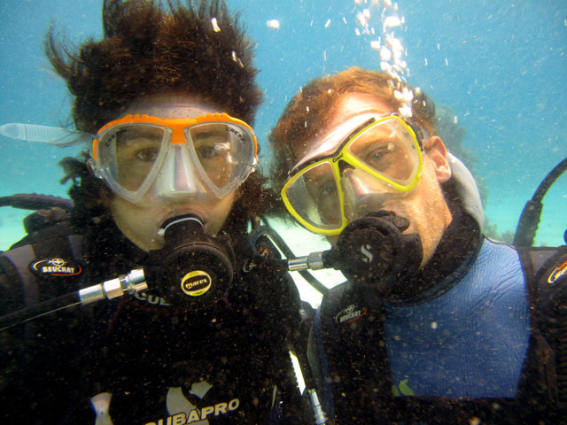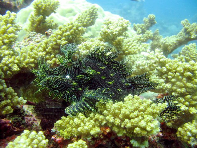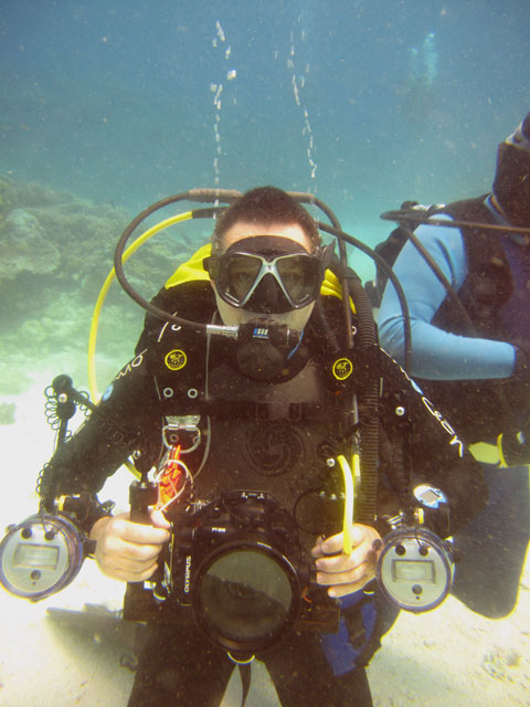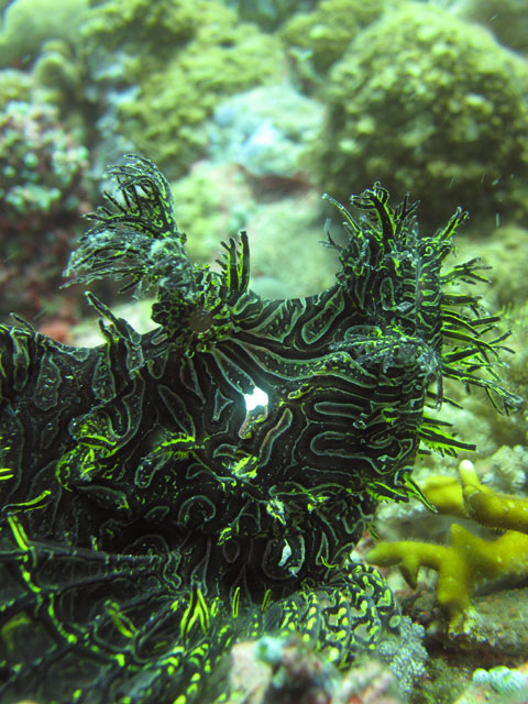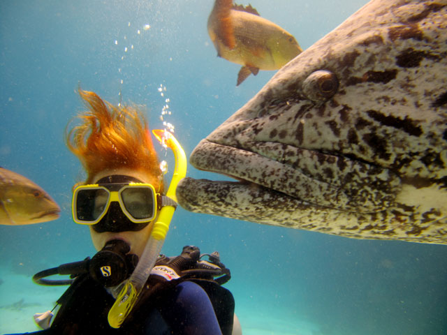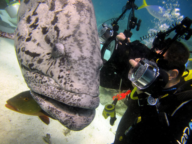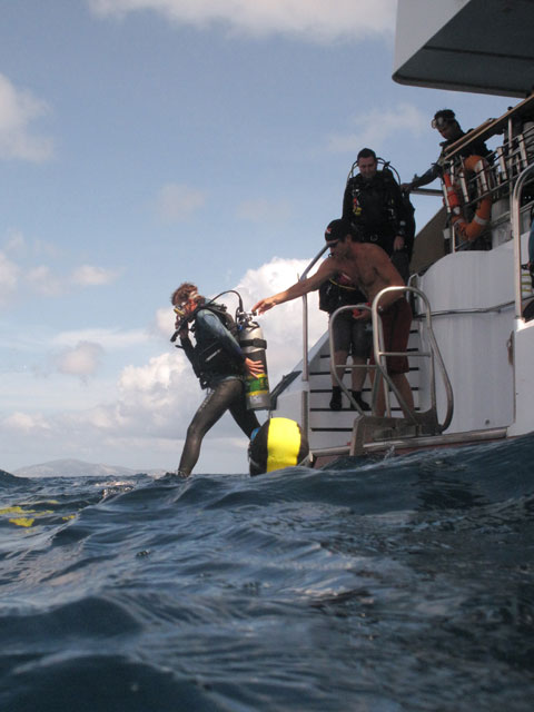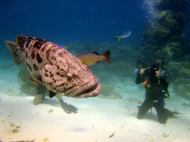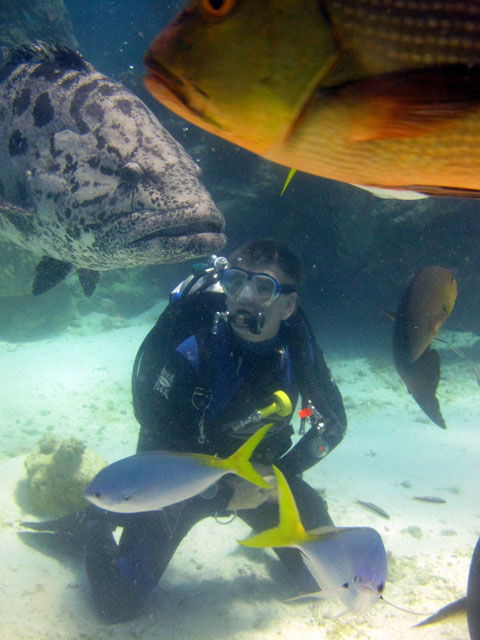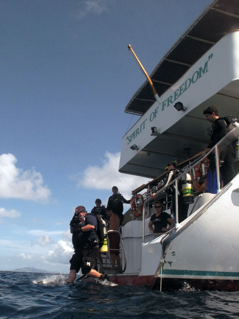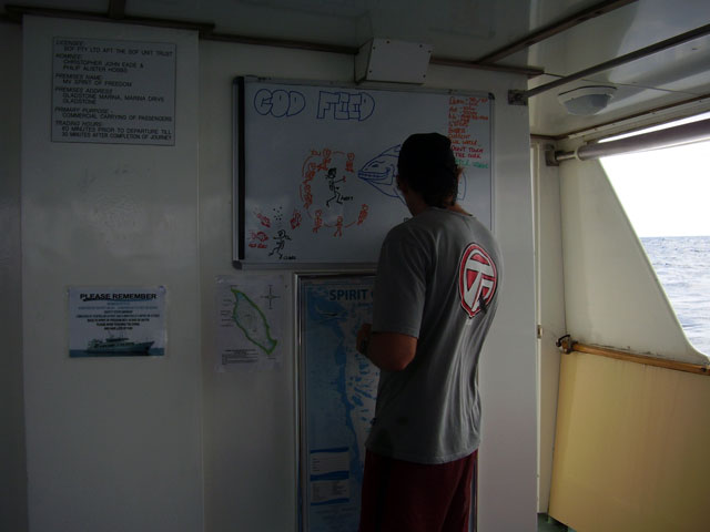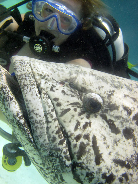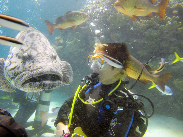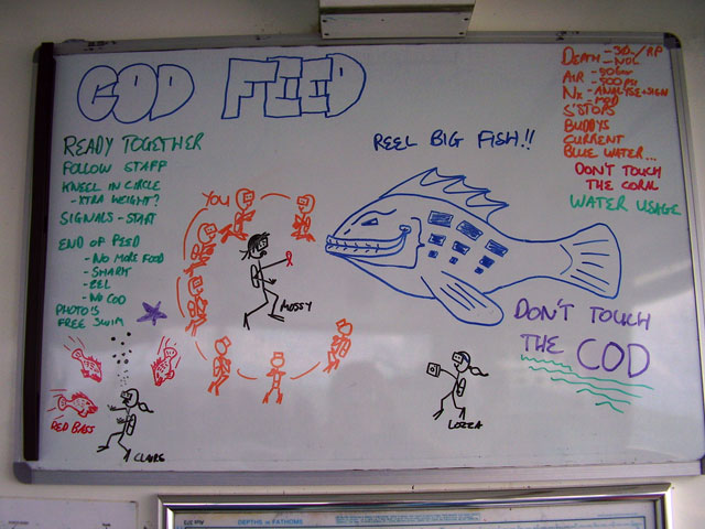 | Boat: Spirit of Freedom, TUSA Cairns Dive Director: Mossy, TUSA Cairns Excitement was everywhere aboard with the anticipation of the famous Cod Feed dive. After Mossy's briefing we entered the water and headed over to the cod feed area. We all gathered in a large circle as Mossy took up the centre spot. A number of large cod were already in the vacinity. The top cod duly came in and Mossy started the feed. A few times one of the other cod tried to mussle in on the action, but the head cod quickly chased it away. The whole thing was a most delightful experience. After the feed we started to make our way back to the boat, taking our time to have a good look around on the way. Back aboard Spirt of Freedom, Andrew served up lunch for everyone. |