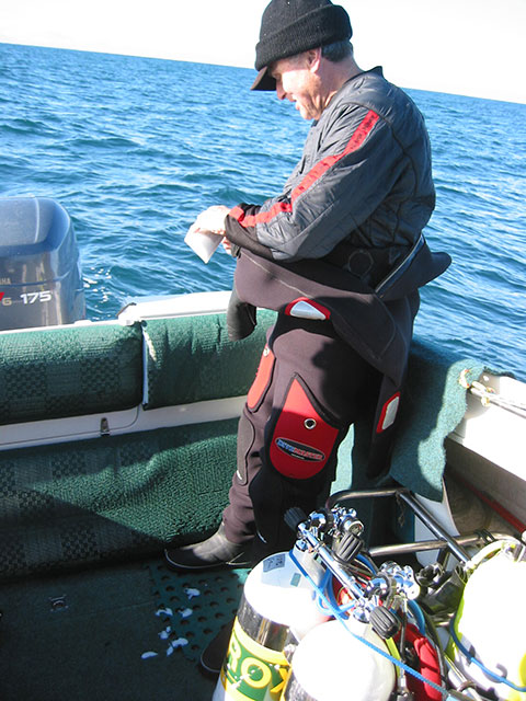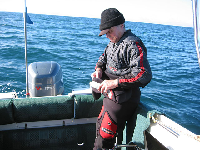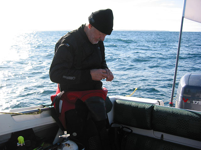 | Boat Captain: John Lawler, VSAG Boat: "Miles Ahead", John Lawler's 6.5m 175HP, Sorrento Cheryl came along as a deckie to accompany John Lawler, Dave Kelly and myself on a dive to the HMAS Canberra. I had my twin setup along together with a single stage cylinder so that I could see what it would be like moving through the wreck with a stage cylinder for the first time. We headed out from Sorrento and tied up to the public mooring. John and David went in for their dive. On their return, I geared up and went in solo. The visibility was pretty bad but I made my way to the bridge and started to move around the area behind and bleow the bridge. So got the hang of tucking the stage under as I moved through narrow doorways etc. Made my way up to the forward mast and shot my DSMB. Took a compass reading and headed in what I hoped would be the right direction. I was having images of the others laughing as they watched my DSMB heading off course. However, the mooring buoy eventually came into view 2 metres ahead and I then changed track to where I thought the boat would be. We headed back inside the bay and had lunch. Then Dave and John did a drift dive on Boarfish Reef. We'd given Cheryl lessons on driving the boat, so left her to do so while the guys were in the water. She did an excellent job. So JL left her driving the boat as we headed back into Sorrento. Once we'd retrieved the boat and transferred our gear we all headed back to The Scuba Doctor in Rye. |
