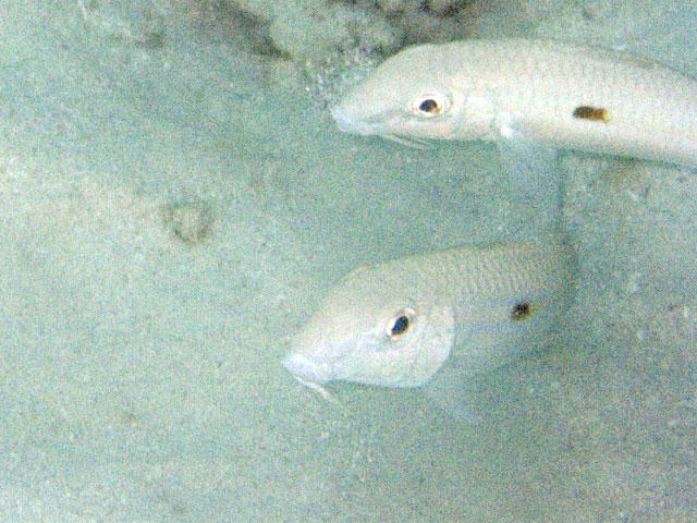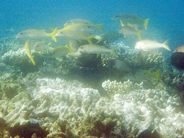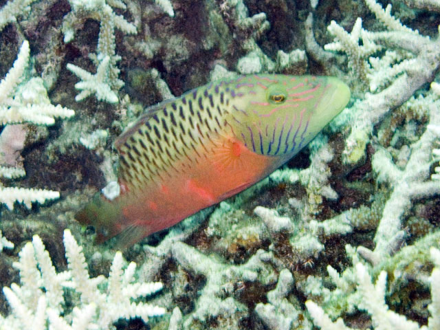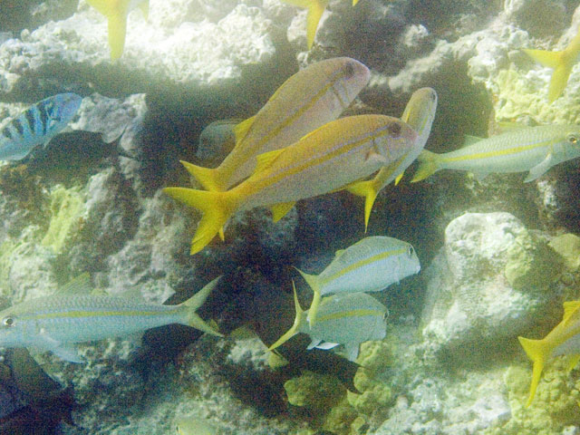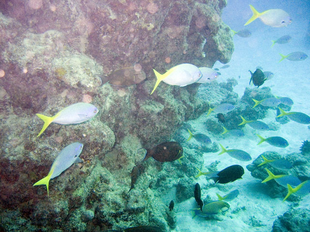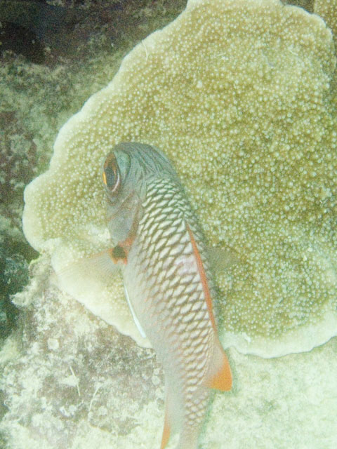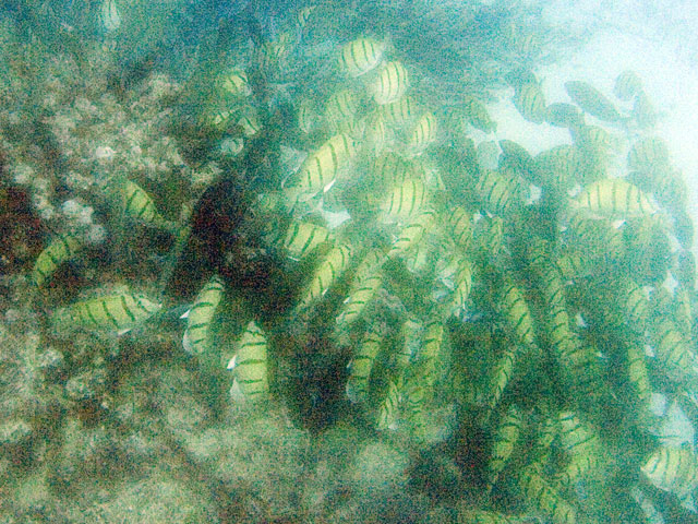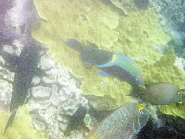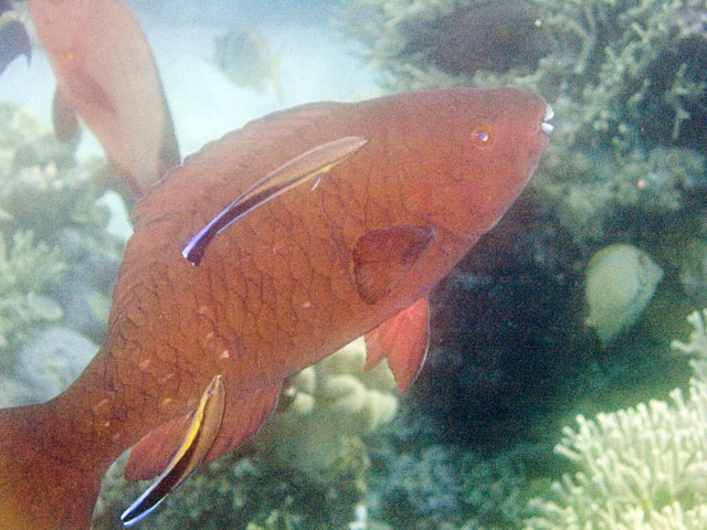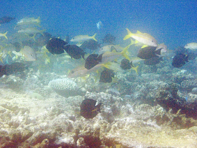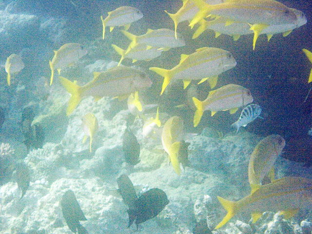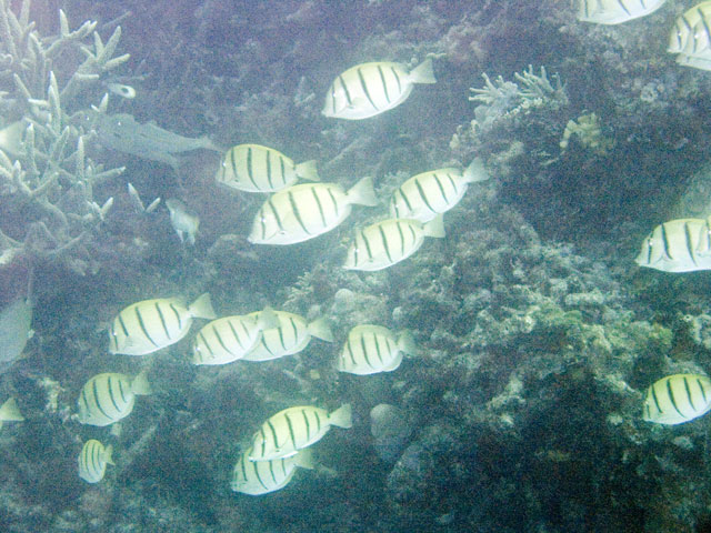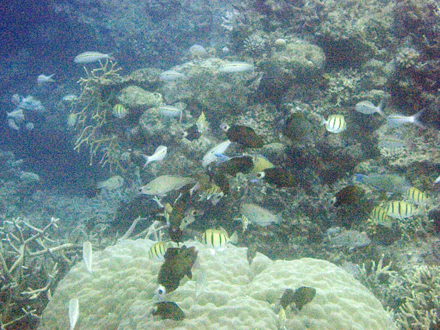 | Divemaster: Zach, Pro Dive Cairns Boat: MV Scubapro 1, Pro Dive Cairns An early morning start. I was up at 4am, an hour before anyone else and keen to get back into the water. This was a time limited dive, so the sooner we were in, the longer the dive could be. Mick and I were in first and we got an excellent photo of everyone still on board getting ready. Again we found many more schools of fish on these morning dives than at other times. And again, the different varieties of fish and coral were simply amazing. We went deeper at first, but ended up mostly drifting around at very shallow depth quietly taking it all in. Mick and I ended up surfacing well away from the boat. "Just as well we still have 5 minutes to make it back", I said. Mick replied, "But we're going to need more time than that." Zach came out in the tender and dragged us back in. |