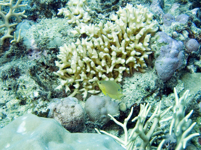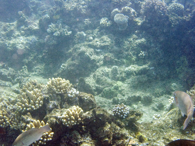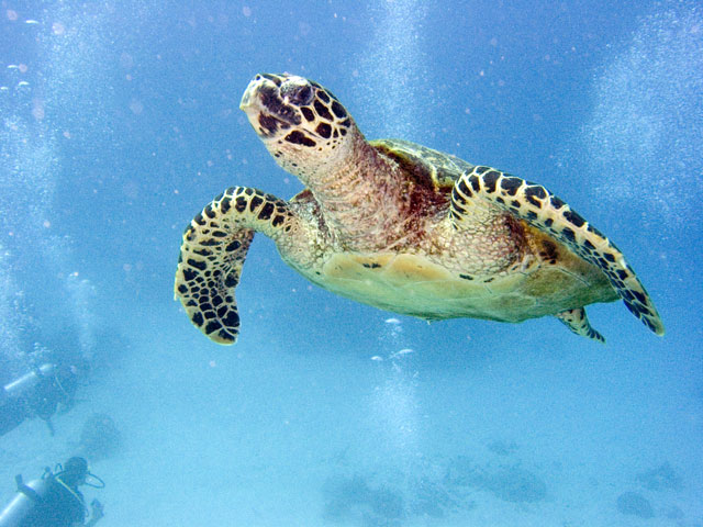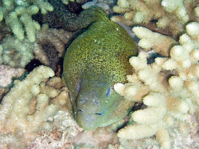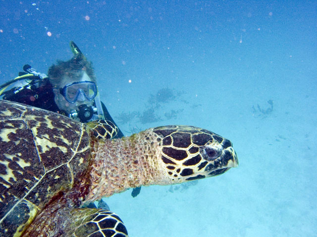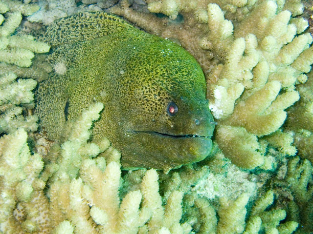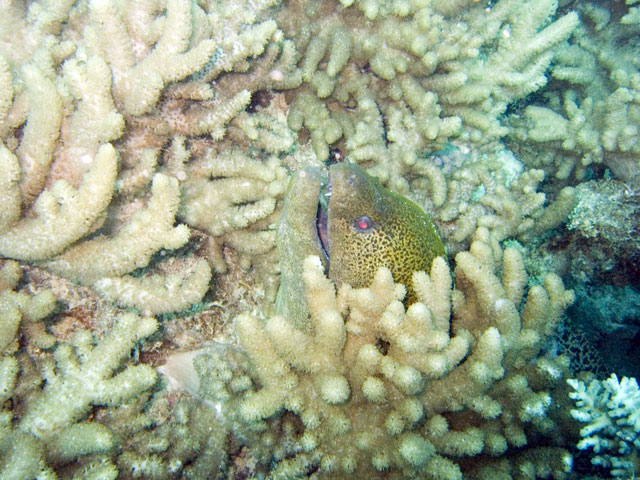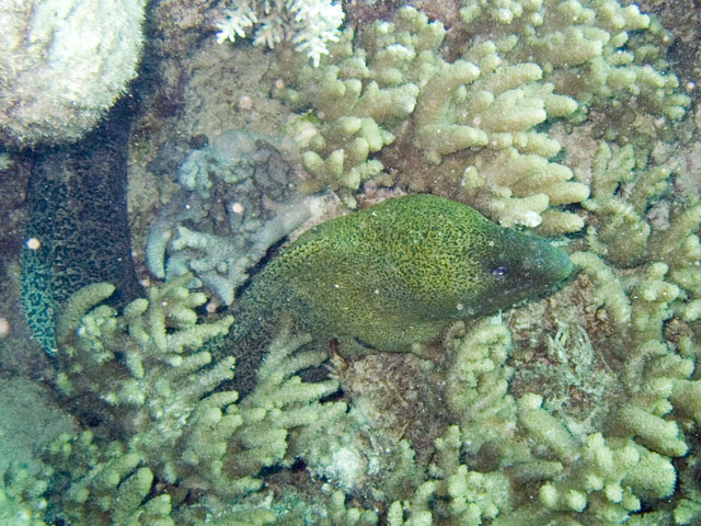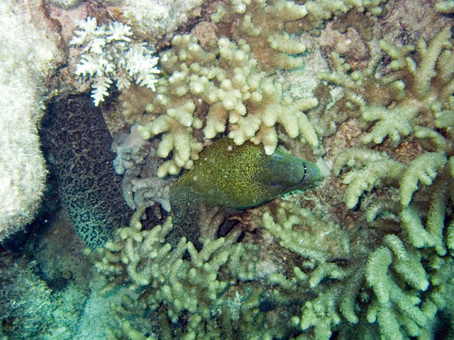 | Divemaster: Teresa, Pro Dive Cairns Boat: MV Scubapro 1, Pro Dive Cairns Again, a time limited dive and thus we were in the water early. The specified max depth for the dive was 14 metres, but because I was flying out around 24 hours later, we decided to be even more conserative and set a deoth limit of 10 to 12 metres. Just after descending near Tracy's Bombie, I spotted a turtle. I eventually got Mick's attention and we swam with it for a while. Others joined us as they came past as they journeyed out to the bombie. We left the turtle alone and started to explore the bombie. One of the others had found a large moray eels so we checked it out. Then we spotted another turtle and joined up with it. It took us well below our intended max depth, so we spent the rest of the dive in the shallows, drifting around and taking it all in quietly. Again, some great photos from this dive. |