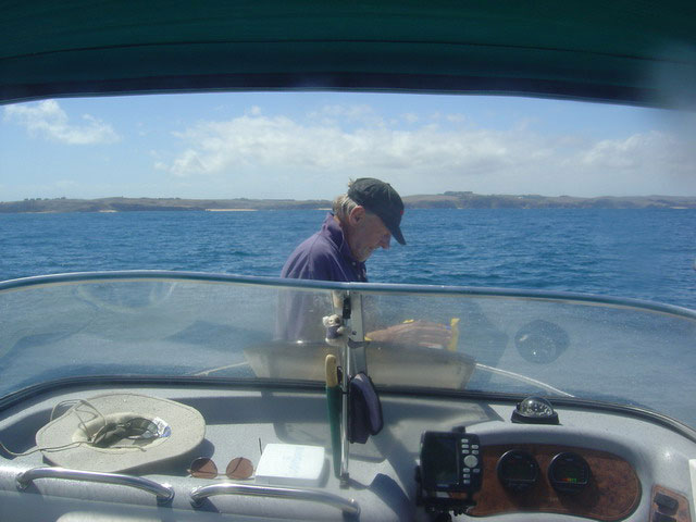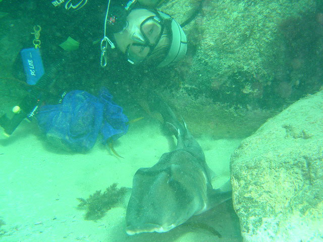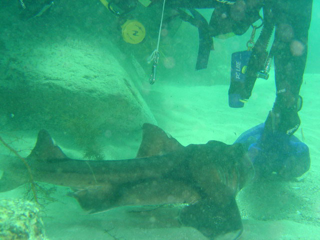 | Divemaster: John Lawler, VSAG Boat: "Miles Ahead", John Lawler's 6.5m 175HP, Sorrento The other boat headed back to Newhaven. But Ken, Takae and myself were interested in doing another dive on the reef at Cape Woolamai. As we were gearing up to go in, a Victoria Police boat came alongside to give that ever suspicious looking John Lawler a licence and safety check. We asked if we could switch dive boats. "Only for a couple of hours," was the reply. We went in and descended onto an amazing reef. Abalone were to be seen about, plus plenty of fish. At one stage we were surrounded by a large school of salmon. We came across a Port Jackson shark that wasn't at all concerned about us. Indeed it let us pat him. I found the eaten out shell of a cray. With dive sites like this teeming with such abundant marine life available here in Victoria, it makes you wonder why you even bother thinking about going anywhere else. When we finished the dive we headed back to Newhaven, retrieved the boat and headed to a local fish and chip shop where we had some ice creams, chips, and shared a cray. |